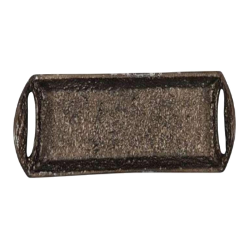 Long Handled Console Tray A sturdy, elongated metal tray with a deep, heavily textured finish and practical integrated handles. Perfect for organizing items like remotes or displaying candles on a console.