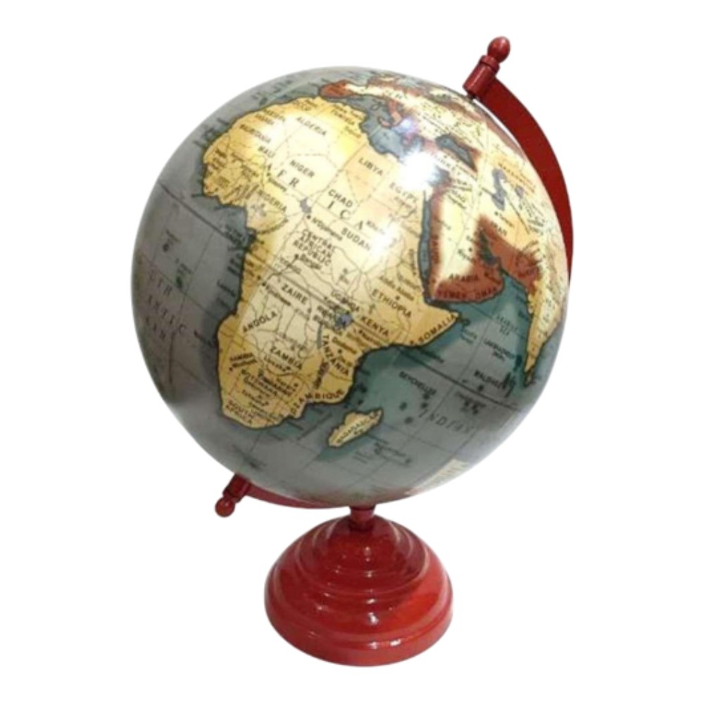 This decorative desktop globe offers a unique, modern-vintage look. It features antique-style, parchment-colored continents set against contemporary grey oceans. The globe is mounted on a striking, glossy red pedestal base and a matching red semi-meridian, making it a bold accent piece for any desk, office, or study.