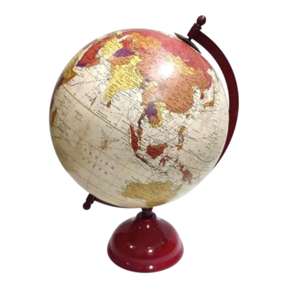This vintage-style desktop globe features an antique-inspired map with parchment-colored oceans and richly-toned continents in shades of red, yellow, and tan. It is mounted on a glossy, deep-red pedestal base and a matching semi-meridian, perfect for adding a touch of traditional, scholarly elegance to any desk or library.