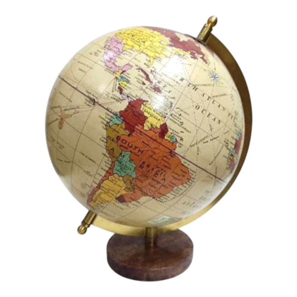 This classic desktop globe features a vintage-style political map with parchment-colored oceans and multi-toned continents. It is mounted on a solid, dark wood base and is accented by a sophisticated gold-tone (brass) semi-meridian, perfect for adding traditional, scholarly charm to any office or study.